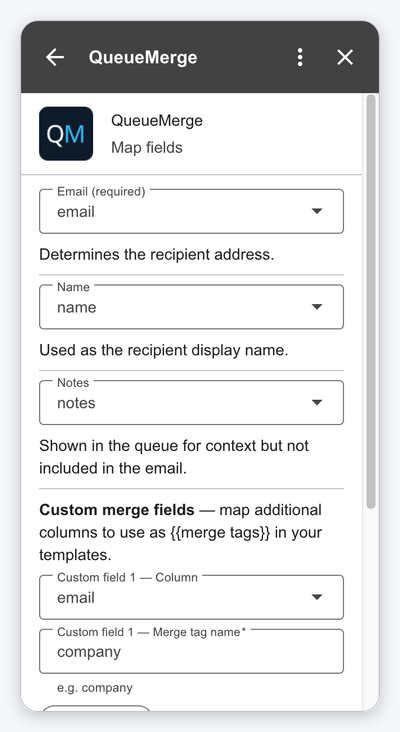 Open QueueMerge from Google Sheets™ and map columns to merge fields.